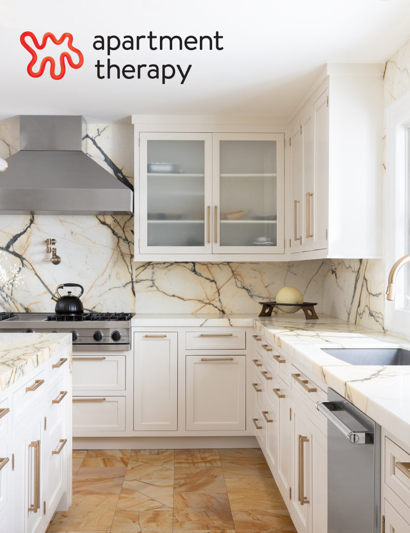 Artistic Tile CEO Josh Levinson transformed his kitchen with richly veined Paonazzo Marble, pairing bold countertops and a full-height backsplash for a timeless, elevated look.