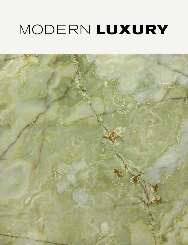 Your luxury kitchen mood board is complete with Arabescato D'oro, Adena, Bronze Fantasy, Opia Nero, Ming Classico, and Botanic Green, as noted by Modern Luxury Interiors.